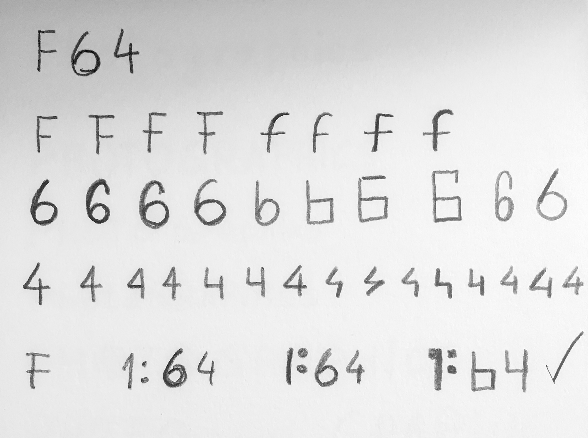 Then I realized that if I design the dots as squares and the "1" as a thick line with square corners it would look even more as both an "F" and as a ratio "1:". In order to have everything consistent in my logo design I made the number 64 square as well.